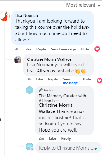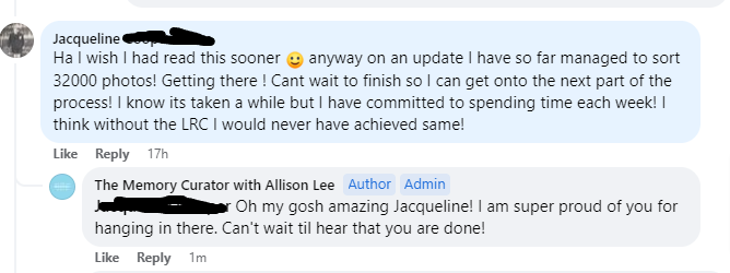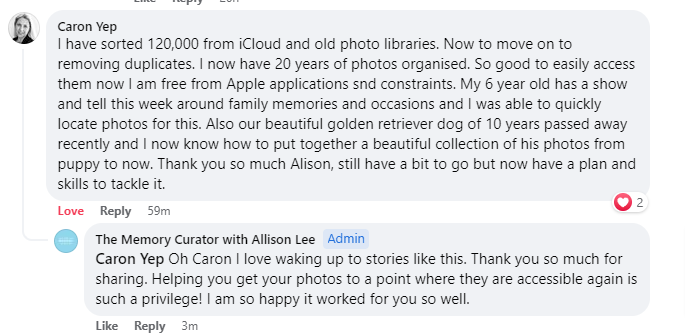 Just listen to Ann talk about how "life-changing" learning to sort out her photo mess has been for her. After 31 years of having "organise my photos" on her to-do list she was FINALLY able to tick it off after taking classes from Allison at The Memory Curator.